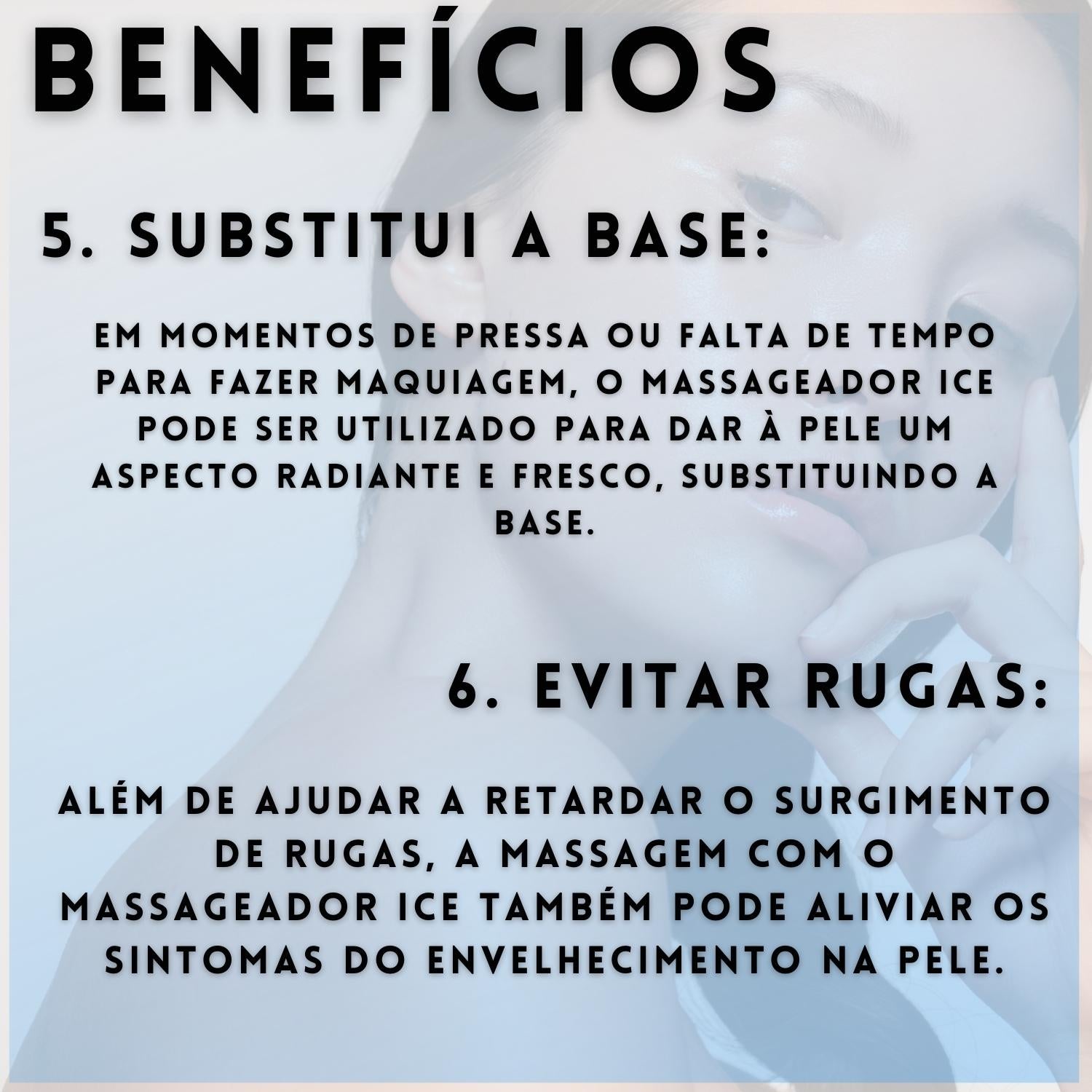 O Massageador ICE traz diversos benefícios para a pele, incluindo o brilho natural e saudável. Ele também é eficaz na redução da inflamação e vermelhidão de espinhas e manchas, além de ajudar a diminuir as olheiras quando combinado com suco de pepino e água de rosas congelada. O massageador ICE pode ser utilizado para melhorar a tenacidade da pele, reduzindo e fechando os poros, deixando a pele lisa e uniforme. Além disso, pode substituir a base de maquiagem para um olhar radiante e fresco sem maquiagem. Por fim, o massageador ICE também é útil para retardar o surgimento de rugas e aliviar os sintomas do envelhecimento.