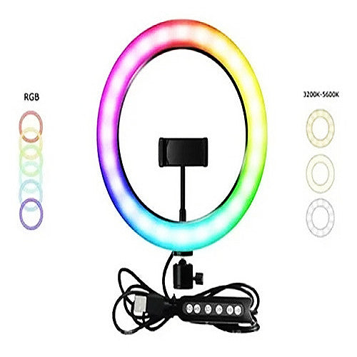 O Ring Light LED RGB possui 6 tipos de cores, tem 3 opções de temperatura de cores e 10 opções de intensidade da cor, podendo ser alternados direto no controle de iluminação, os efeitos podem ser usados de acordo com diferentes ambientes de escurecimento.