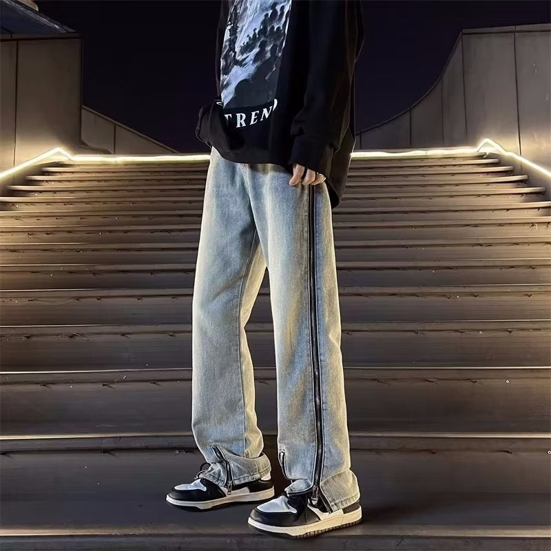 A calça jeans larga com ziper como detalhe é a escolha ideal para quem valoriza o visual...