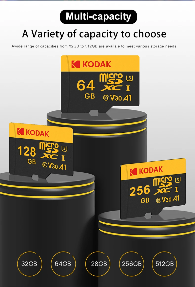 • Alta capacidade do armazenamento:O Cartão Micro SD Kodak oferece uma enorme capacidade de armazenamento que varia de 32GB a 256GB, perfeito para armazenar vários arquivos, como vídeos, fotos e documentos.