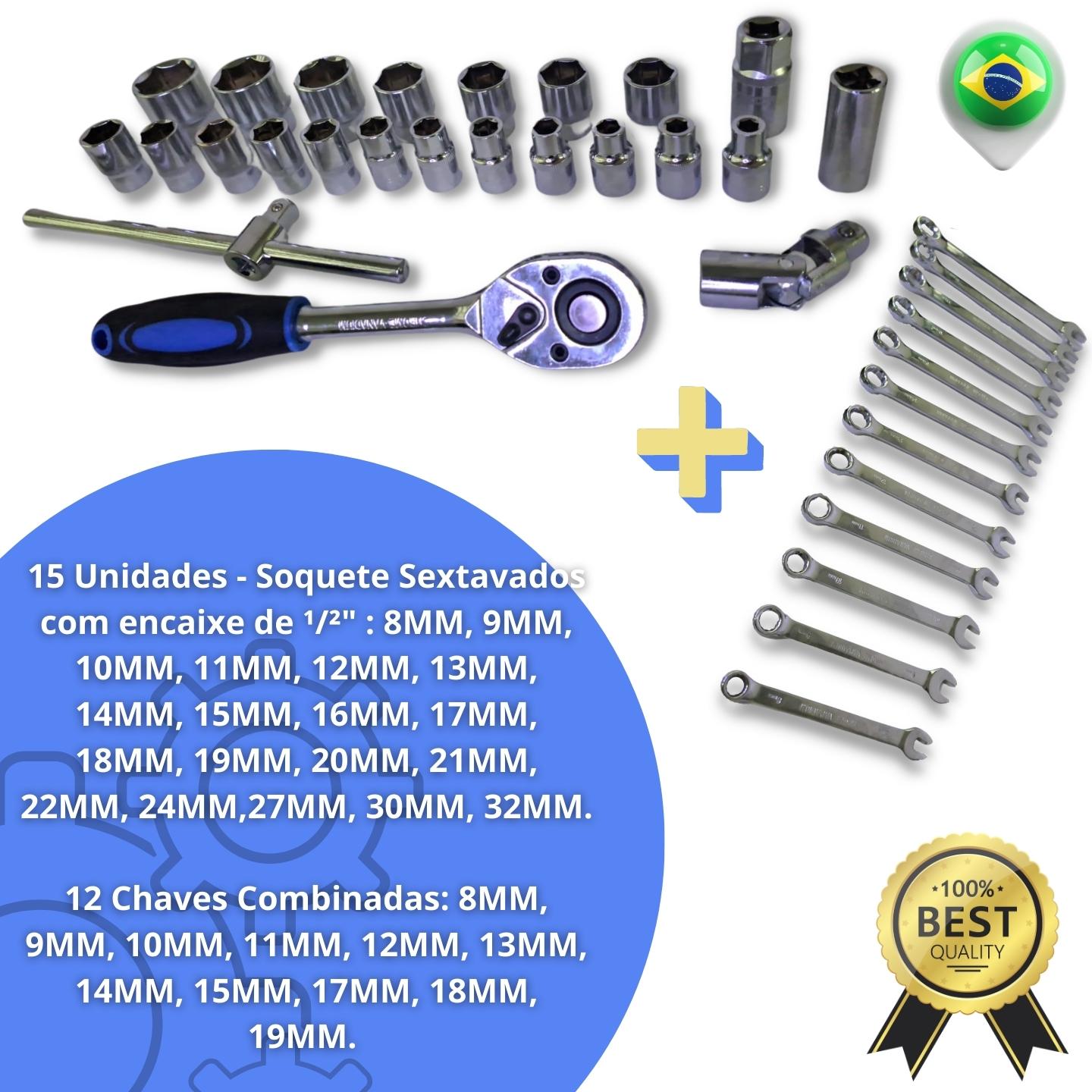 KIT de Ferramentas com 37 Peças COMPLETO15 Unidades - Soquete Sextavados com encaixe de ¹/²" : 8MM,...
