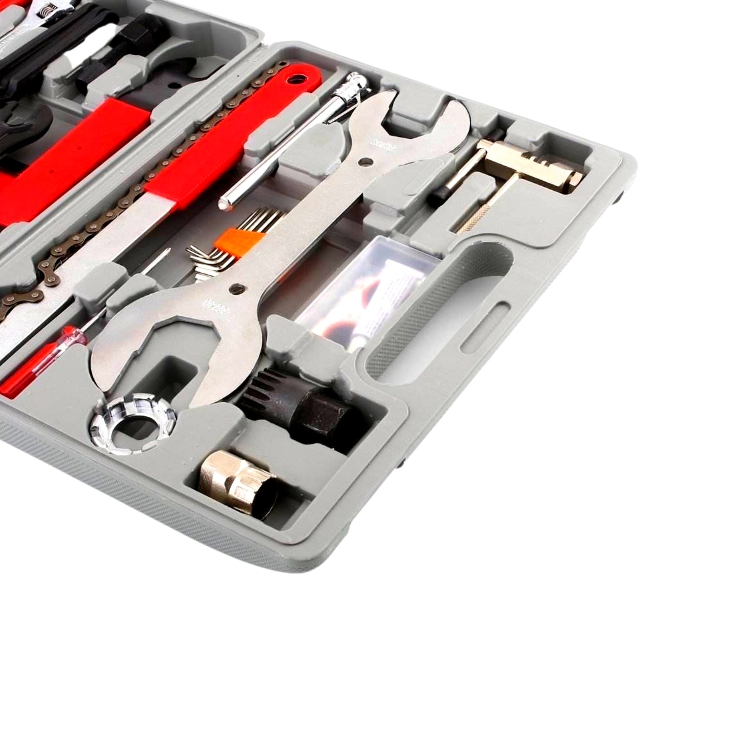 Este kit inclui tudo o que você precisa para reparar sua bicicleta, desde uma maleta para facilitar o transporte, até uma ferramenta de suporte inferior ajustável para uma manutenção precisa.
