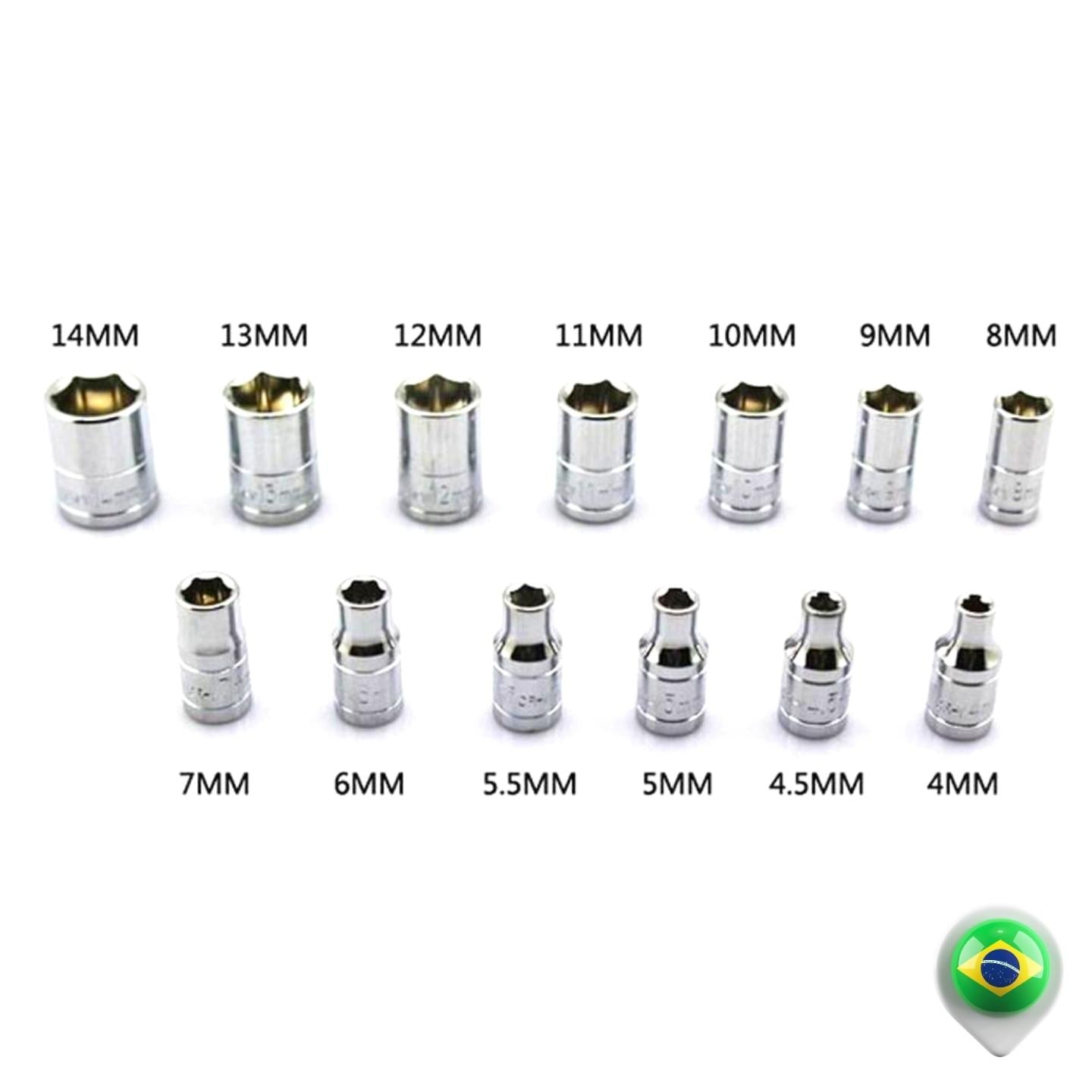 Jogo de soquetes Bits 1/4 em aço cromo vanádio é composto por 46 peças, produzidas com aço...